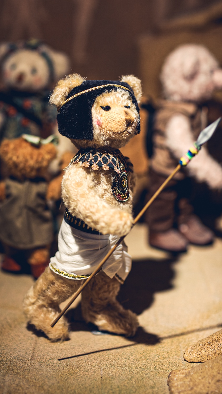 | Đây là chú lính gác trong thánh địa Ai Cập. Tôi khá bất ngờ vì dù là mô hình gấu bông nhưng từ trang phục đến bối cảnh đều được dựng chân thực đến từng chi tiết. Phần đuôi mắt kẻ kiểu mắt mèo, thể hiện đúng nét văn hoá đặc trưng thời kỳ cổ đại của quốc gia này. |