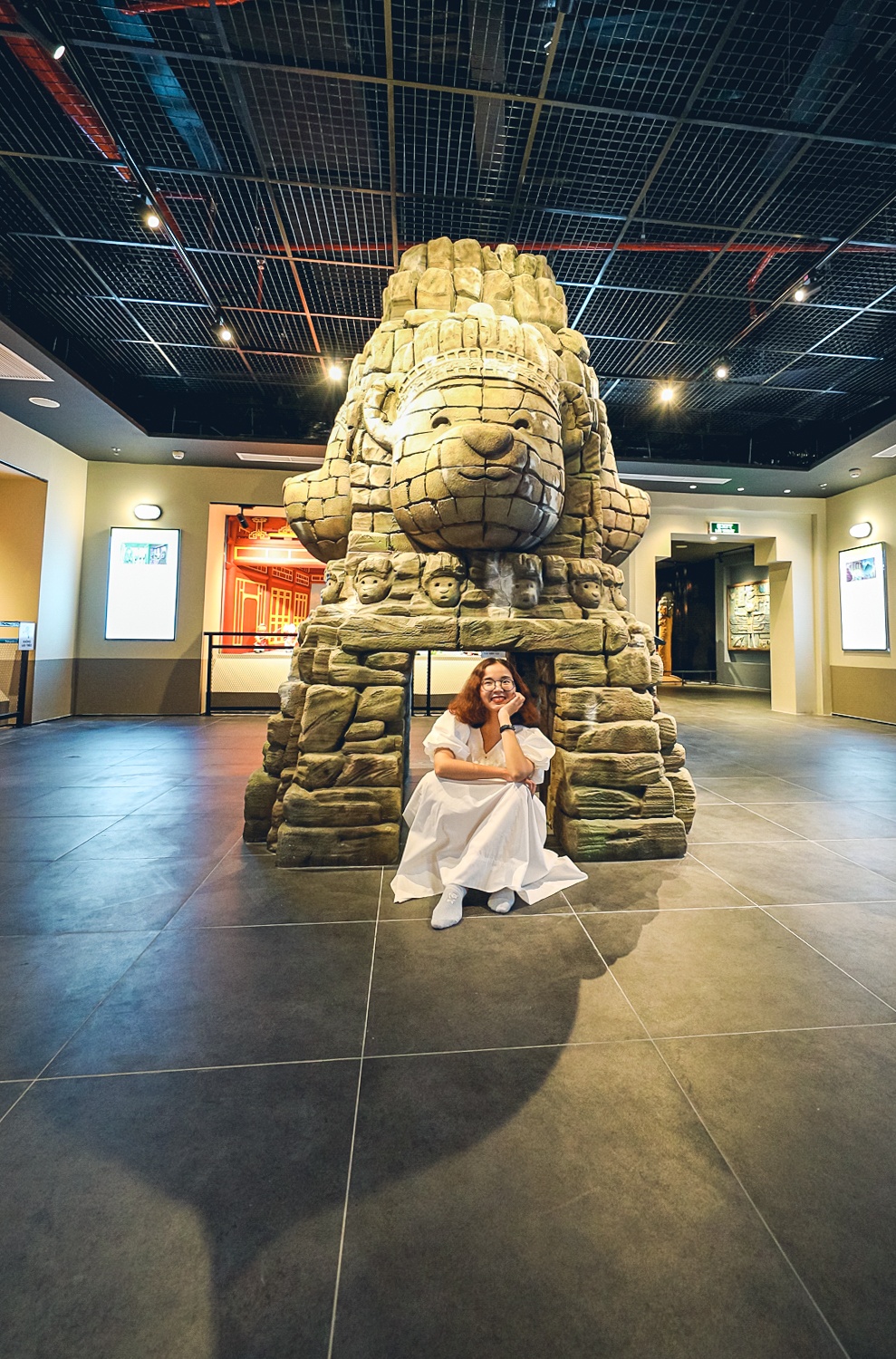 | Qua không gian check-in là nơi trưng bày các cổ vật mà nhà khảo cổ Teddy Jones sưu tầm từ những vùng đất xa xôi hay nền văn minh kỳ bí trên khắp thế giới. Tại đây lưu giữ 12 mô hình. Tôi ấn tượng với bức điêu khắc Teddamerica được trục vớt từ đáy biển Thái Bình Dương - một trong những cổ vật lớn nhất được trưng bày tại đây. |