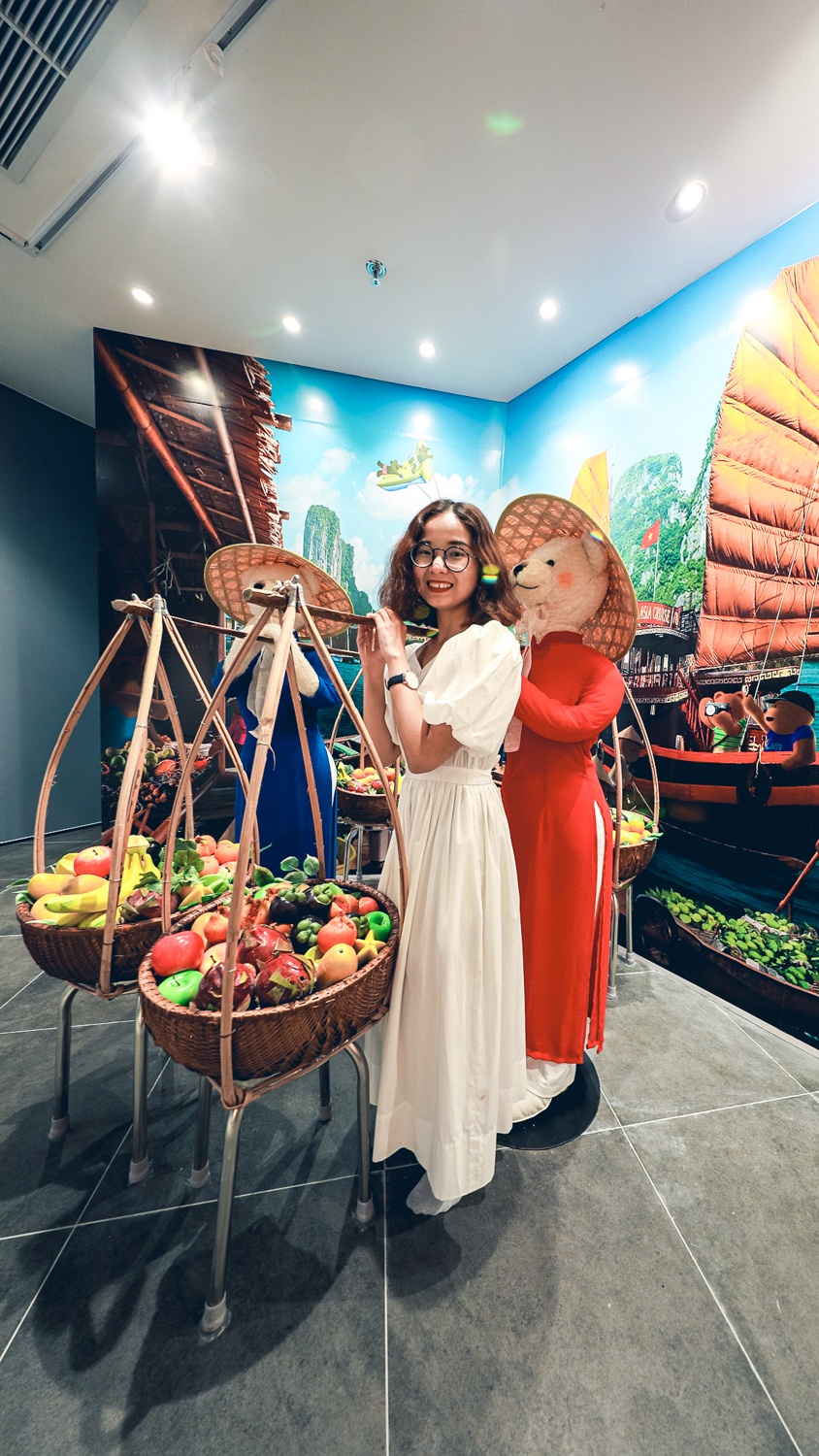 | Tôi cũng nhanh tay “phụ” các bạn gấu Teddy “đỡ” chiếc quang gánh trái cây bằng tre. Điều tôi thích nhất ở góc check-in này là tượng gấu mặc trang phục áo dài truyền thống, đường may được chăm chút tỉ mỉ. |