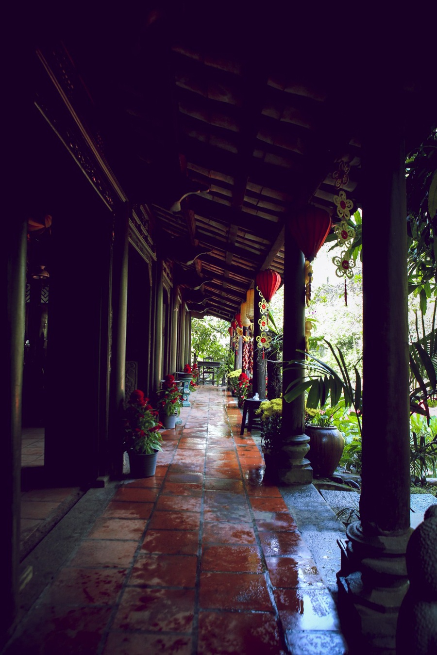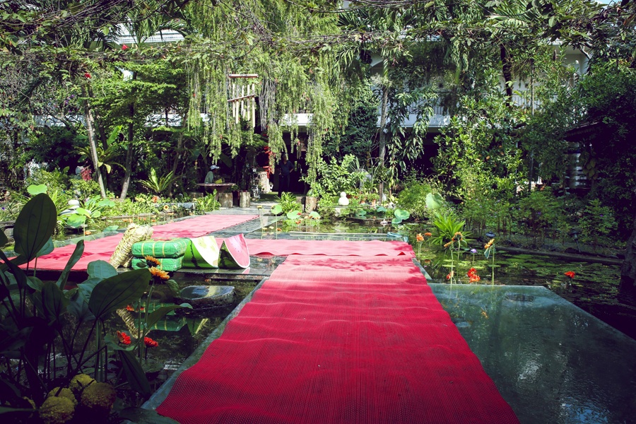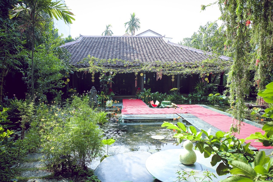 | Lối đi trên hồ nước dẫn đến khu vực thờ cúng. Nhà thờ tổ tiên của gia đình Thiên Lý được xây theo phong cách niềm Trung, đậm chất Huế. |