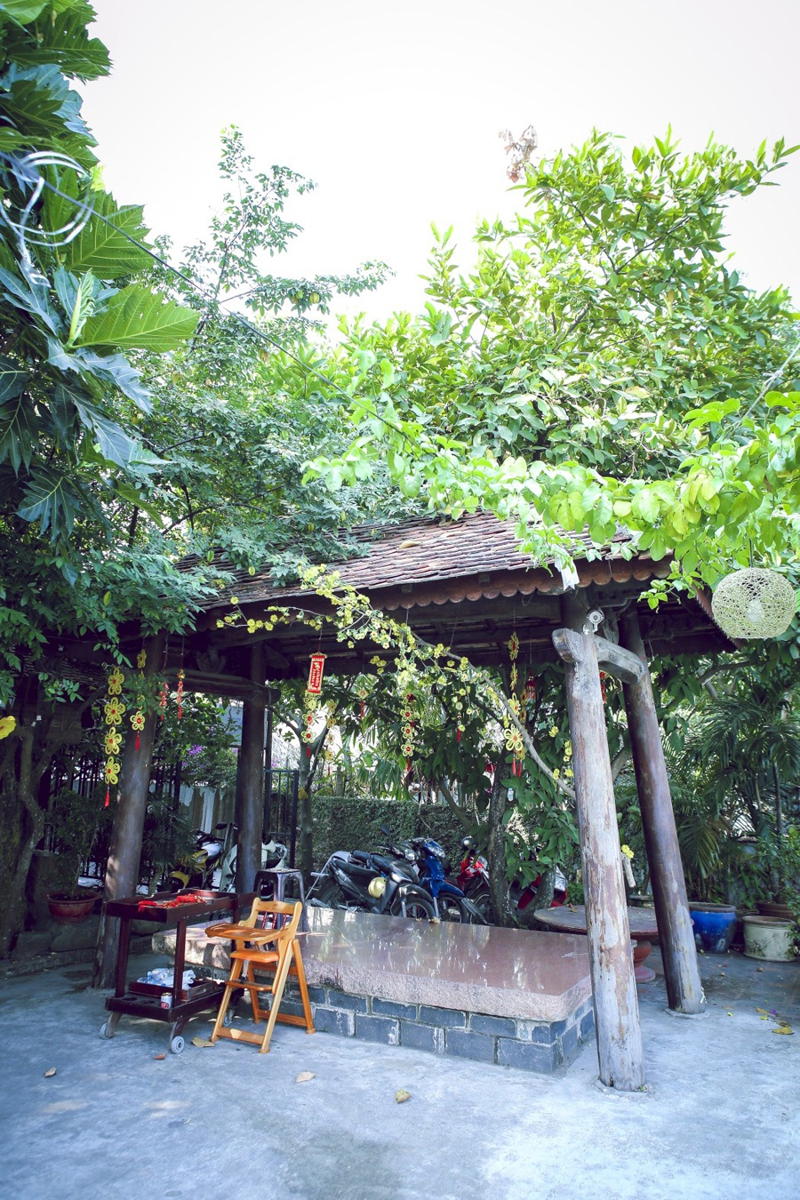 Một góc sân vườn là khu vực uống trà, nơi thả cần câu cá. Đây cũng là khoảng không yêu thích, gắn liền với tuổi thơ của á hậu Thiên Lý.