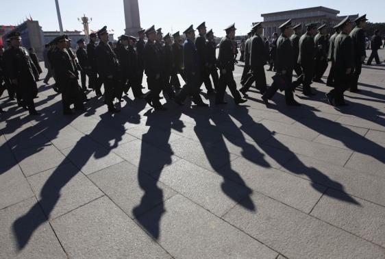 | Các quan chức quân đội đi về phía Đại lễ đường Nhân dân để tham dự cuộc họp Quốc hội vào ngày 4/3/2013. Ảnh: Reuters |