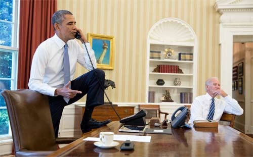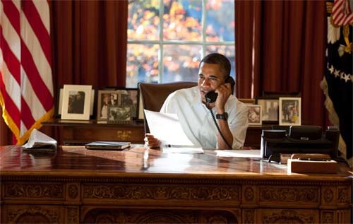| Obama đang trò chuyện qua điện thoại tại Phòng Bầu Dục ở Nhà Trắng. |