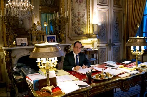 | Tổng thống Pháp Francois Hollande tại phòng làm việc của ông ở Điện Elysee, thủ đô Paris. |