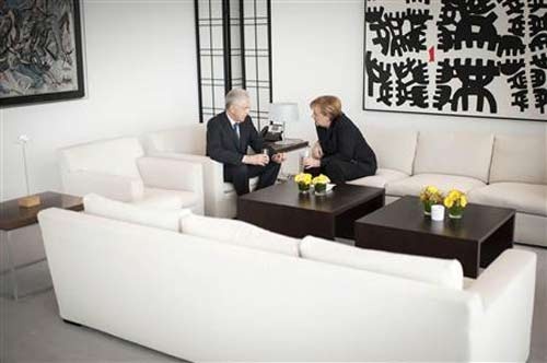 | Thủ tướng Đức Angela Merkel tiếp thủ tưởng Italia Mario Monti tại phòng làm việc của bà ở Berlin hồi tháng 1/2013. |