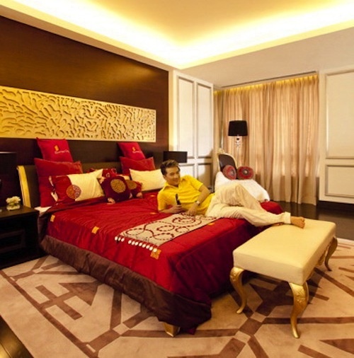 Phòng ngủ được bố trí liên hoàn vừa mang lại sự thoải mái, tiện nghi khi sử dụng vừa dễ sắp xếp đồ đạc, trang trí tranh ảnh, đồ lưu niệm trong các chuyến lưu diễn của ca sĩ Đàm Vĩnh Hưng. |