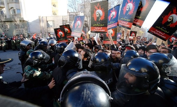 | Đám đông người biểu tình bên ngoài đại sứ quán Saudi Arabia ở Iran sau khi giáo sĩ al-Nimr bị hành quyết. Ảnh: New York Times |