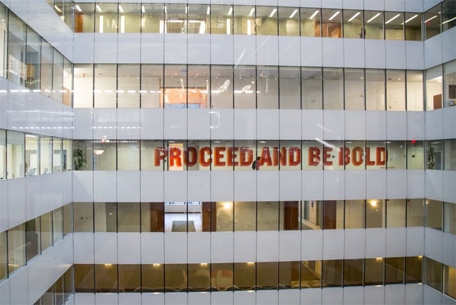 Lối vào văn phòng của Facebook ở Manhattan, New York, với dòng chữ “Proceed and be bold” (tạm dịch: “Hãy tiến lên và mạnh dạn”).