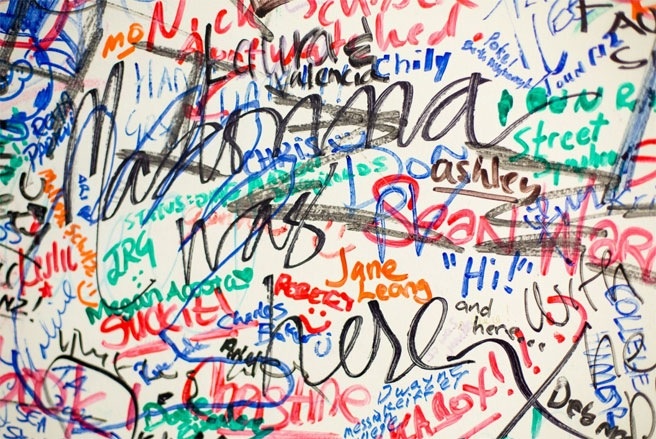 Một bức tường lớn trên lối vào, nơi các vị khách được khuyến khích ký tên mình lên đó.