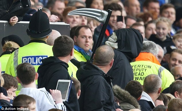 | "Thần chết" bị nhân viên an ninh tống cổ khỏi sân Goodison Park. Ảnh: Daily Mail. |