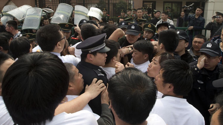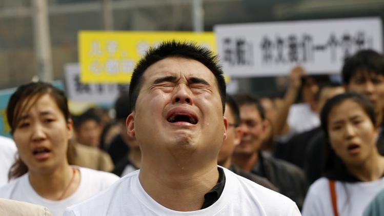 | Wen Wanchang, bố của một thanh niên trên chuyến bay MH370, cùng hàng trăm người tập trung bên ngoài đại sứ quán Malaysia tại Bắc Kinh hôm 25/3 để phản đối cách xử lý vụ việc của chính phủ Malaysia. Ảnh: AP |
