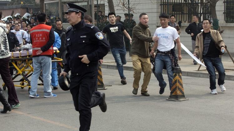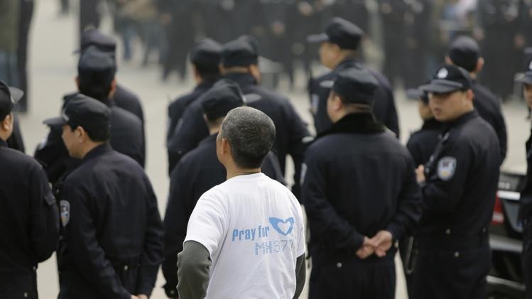 | Một cảnh sát bỏ chạy khi thân nhân của hành khách trên chuyến bay MH370 nổi khùng và muốn tấn công anh. Ảnh: AP |