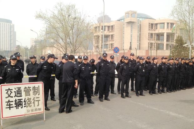 | Cảnh sát phong tỏa một đường dẫn tới đại sứ quán Malaysia tại Bắc Kinh hôm 25/3. Ảnh: AP |