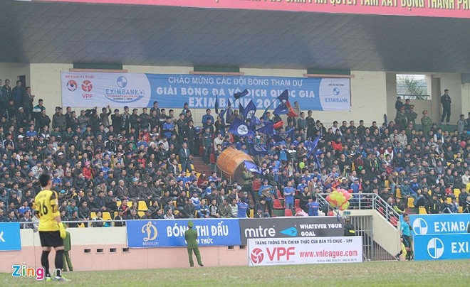 Trái với cảnh vắng vẻ ở nhiều SVĐ, chiều 21/2, sân Cẩm Phả chật kín khán giả. Khán đài C,D cũng chỉ còn vài chỗ trống. Điều này có được là bởi Than Quảng Ninh lần đầu chơi V.League, lại đang có phong độ cực tốt (đứng thứ 3 trước vòng 6).