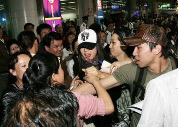 | Jeon Ji Hyun sợ hãi vì sự cuồng nhiệt của người hâm mộ ở Thượng Hải. Cô thậm chí còn bị người hâm mộ giật mất mũ. |