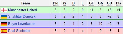 Giành chiến thắng với tỷ số 5-0 trên sân của Leverkusen, thầy trò HLV David Moyes chính thức giành quyền đi tiếp sớm trước một vòng đấu. Sau 5 trận, MU có 11 điểm và tạm thời dẫn đầu bảng A khi hơn hai đội xếp sau Shakhtar Donetsk, Leverkusen lần lượt 3 và 4 điểm.