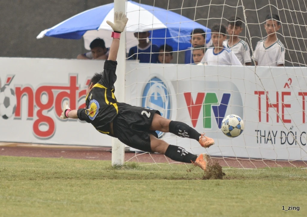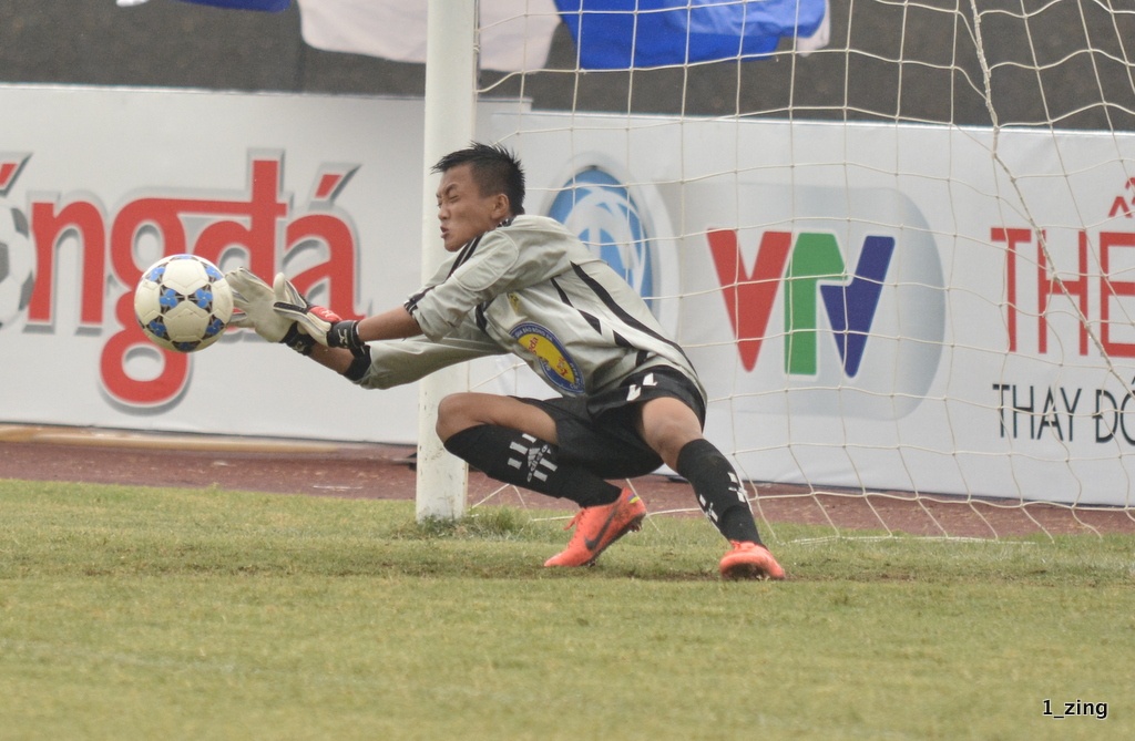 | Ngay ở lượt sút đầu tiên, thủ môn Văn Tú của Hà Nội T&T đã đẩy được cú sút của đội trưởng Duy Khánh. |