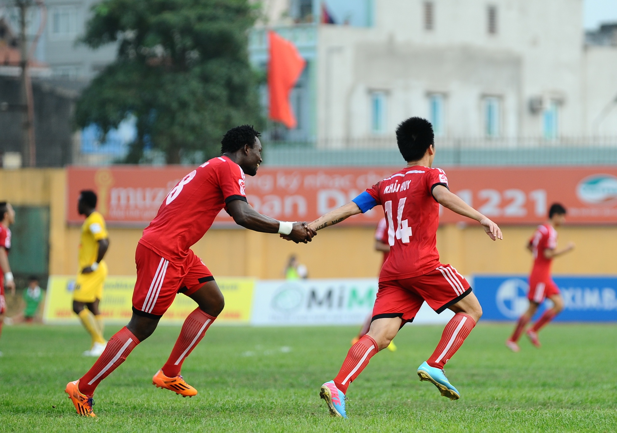 Nguyễn Hải Huy ăn mừng cú đúp vào lưới Thanh Hóa ở phút 14 và 27.