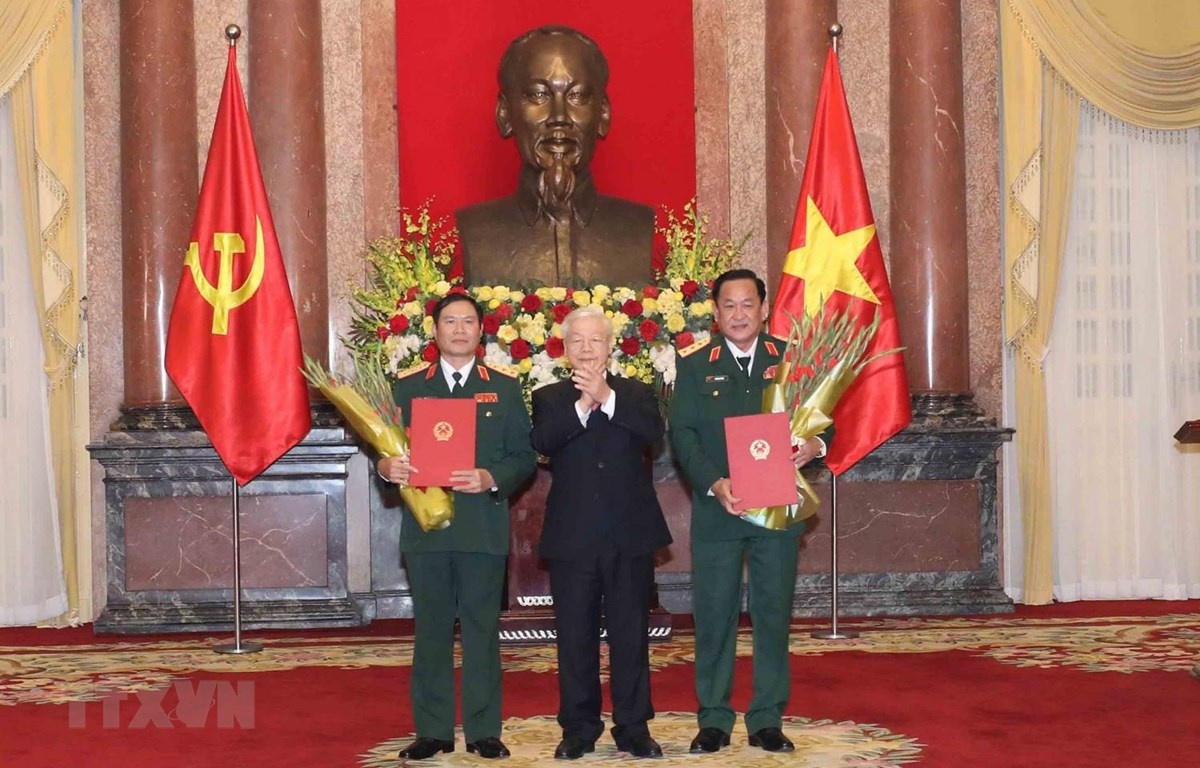 | Tổng bí thư, Chủ tịch nước Nguyễn Phú Trọng, Bí thư Quân ủy trung ương, trao quyết định thăng quân hàm thượng tướng cho 2 thứ trưởng Bộ Quốc phòng Nguyễn Tân Cương và Võ Minh Lương. |