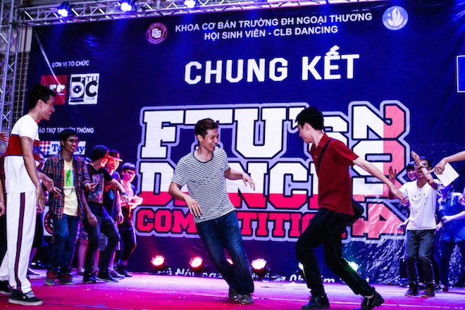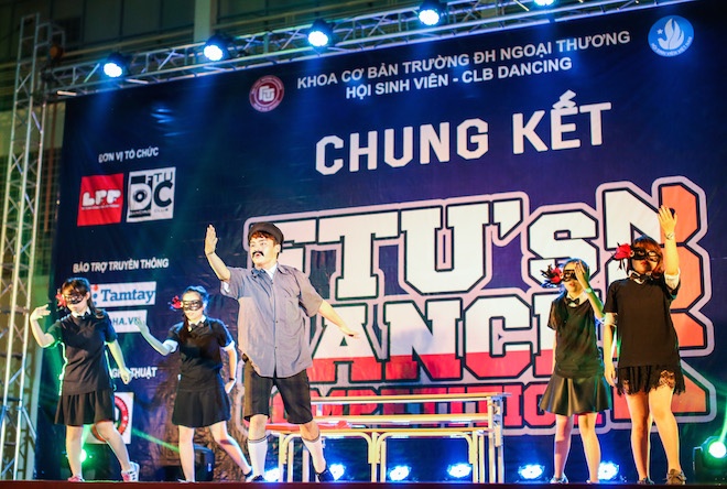 | Vừa qua, ĐH Ngoại thương Hà Nội tổ chức vòng chung kết cuộc thi FTU’s Dance Competition 2014. Đây là cuộc thi nhảy không chuyên dành cho tất cả sinh viên trong trường. Theo đó, bộ đôi dancer nổi tiếng Thành LionT và Chu Quỳnh Trang cùng MC Ninh Quang Trường đã tham dự cuộc thi với tư cách là ban giám khảo. |