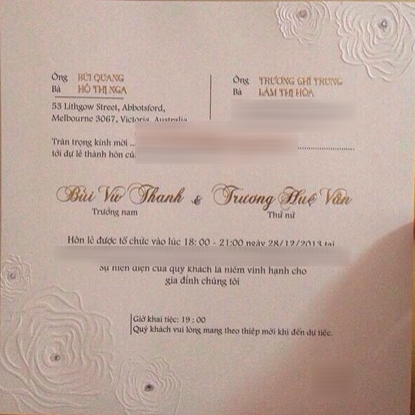 | Thiệp mời đám cưới đã được Thanh Bùi gửi tới bạn bè thân thiết từ vài ngày trước. Những tấm thiệp này được trang trí khá đơn giản với tông màu trắng và những bông hoa in nổi. |