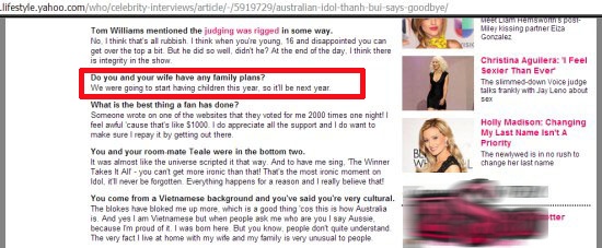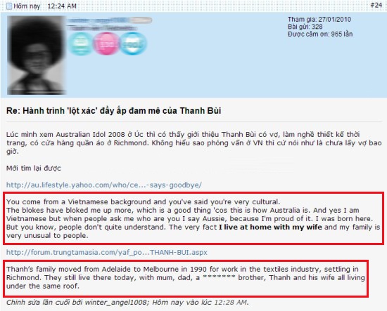 | Cư dân mạng đang xôn xao lục tìm lại những chia sẻ về chuyện có vợ và dự định sinh con của Thanh Bùi khi tham gia Australian Idol 2008. |
