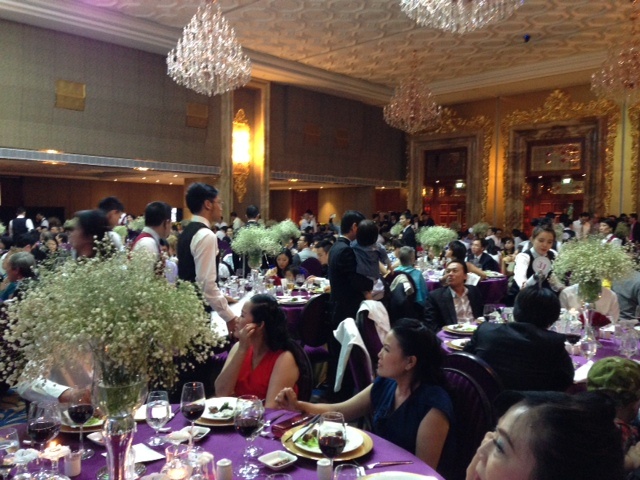 Toàn bộ các bàn tiệc được trải khăn tím. Ghế ngồi cũng ton-sur-ton. Những bình hoa baby màu trắng đặt giữa bàn tiệc khiến không gian sang trọng, ấn tượng hơn. Khách mời đa phần là bạn bè, họ hàng thân thiết và các đối tác của gia đình cô dâu Trương Huệ Vân.