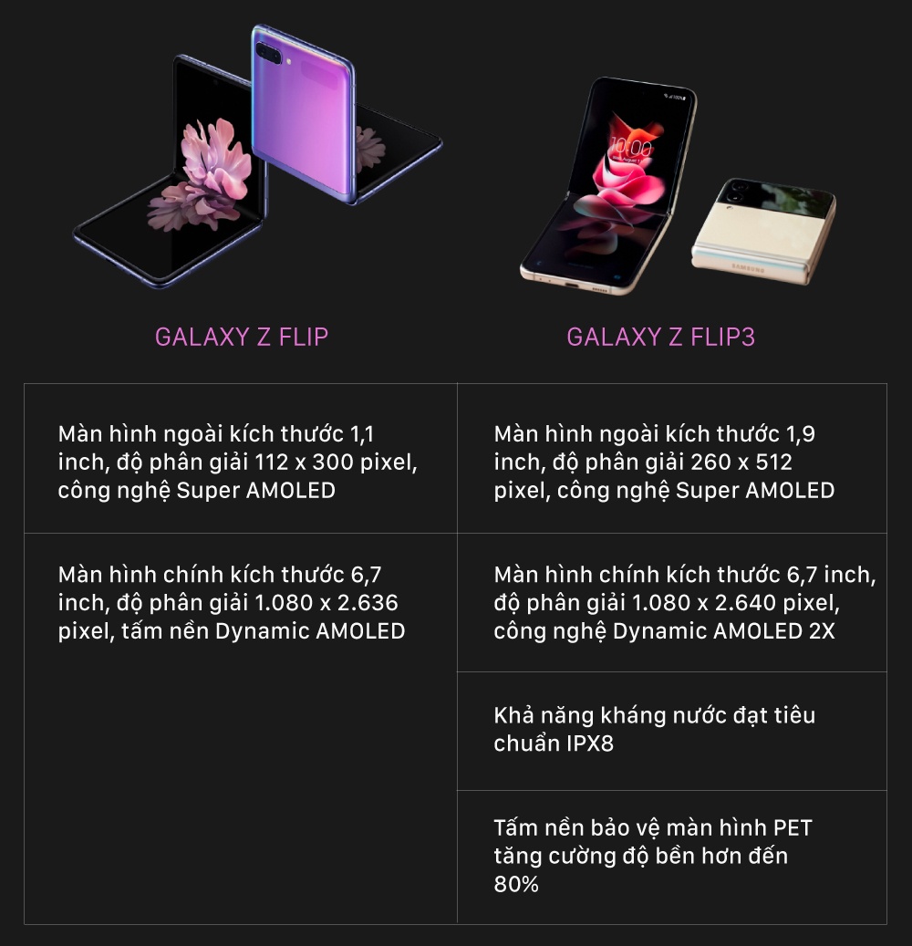 Tại sự kiện Unpacked 2021, Samsung cũng giới thiệu thế hệ tiếp theo của Galaxy Z Flip. Máy có nhiều nâng cấp quan trọng so với smartphone đàn anh như màn hình phụ bên ngoài máy có kích thước lớn hơn. Đồng thời, Galaxy Z Flip3 cũng được trang bị chuẩn kháng nước IPX8, độ bền màn hình cao hơn thế hệ đầu tiên.