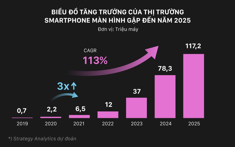 Trong khi đó, theo nghiên cứu của Strategy Analytics, dung lượng thị trường smartphone màn hình gập năm nay đạt 6,5 triệu máy, tăng gấp 3 lần so với năm 2020. Đến năm 2025, doanh số của dòng điện thoại này có thể lên đến 117,2 triệu máy, tăng 53 lần trong 5 năm. Những con số này mở ra cơ hội tăng trưởng lớn cho dòng Galaxy Z series trong tương lai.