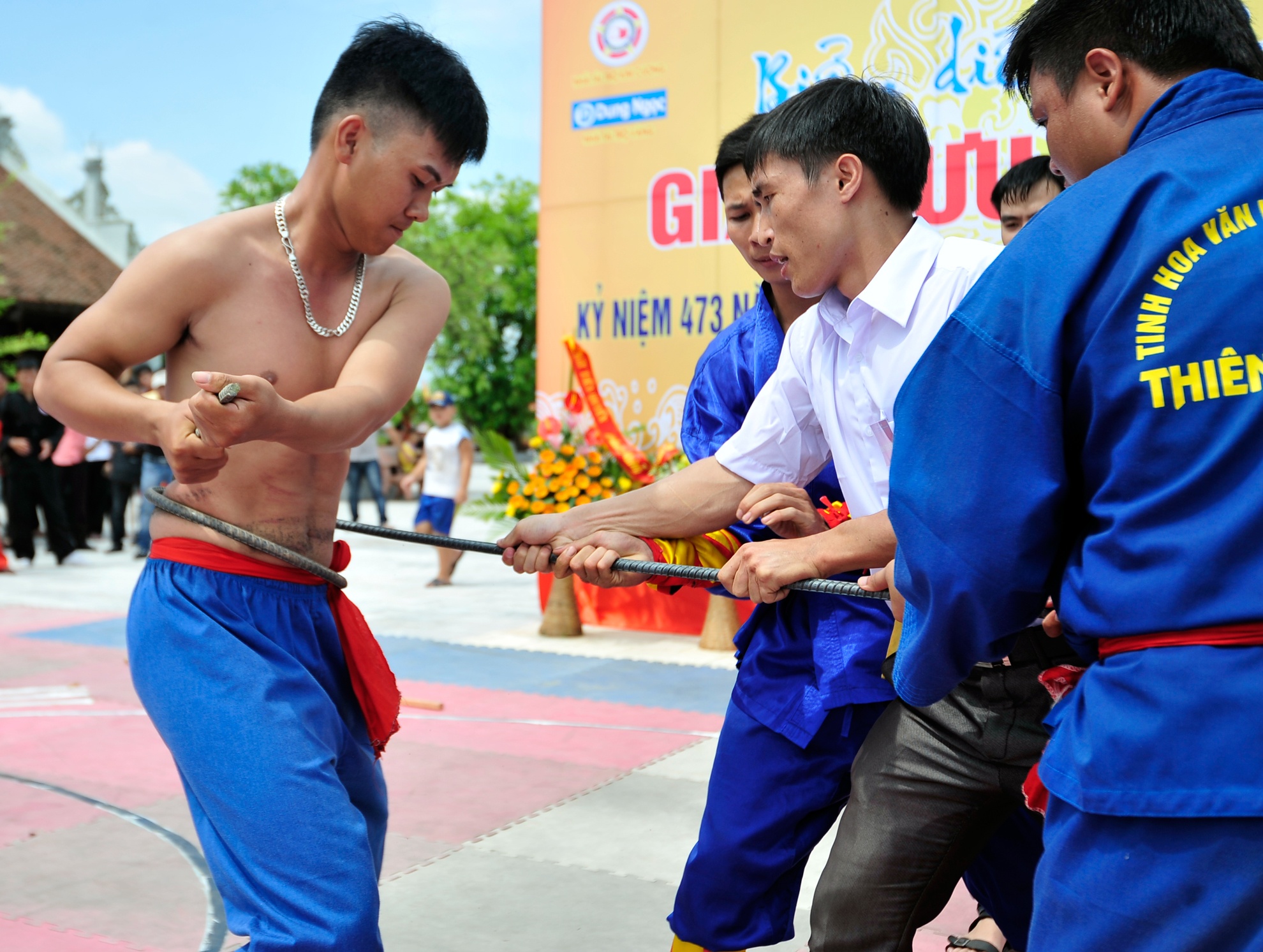 Võ sinh Đinh Hùng - võ đường Thiên môn đạo Tiên Lãng với màn " khấu xỉ xiết hàm công" dùng răng để nhấc cơ thể của môn sinh khác có trọng lượng gần 60kg lên khỏi mặt đất.