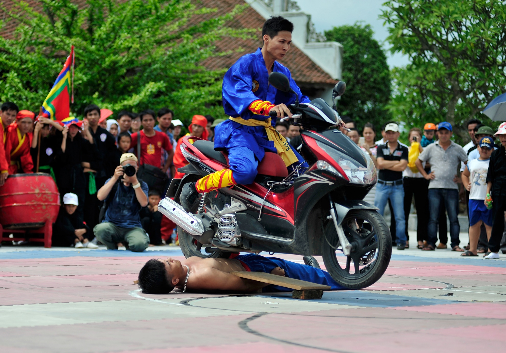 Ngay sau đó anh để cho một người đi xe máy chèn qua cơ thể của mình với tốc độ cao, đòi hỏi thì sinh phải có sức chịu đựng tốt và sự tập luyện nghiêm túc về công phu.