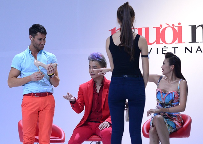 | Tuy nhiên, cô gái trẻ còn chưa kịp đi thử thì Adam Williams - vị giám khảo lắm chiêu đến từ Australia - đã nhanh tay cướp một chiếc giày thuộc dạng hàng hiệu sành điệu của Thanh Hằng. |