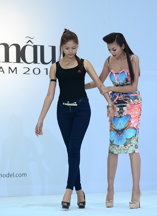 | Sở hữu gương mặt và vóc dáng khá đẹp nhưng chỉ trong chưa đầy chục mét đi catwalk, cô gái trẻ đã có mấy lần suýt vấp ngã. Thanh Hằng lo sợ đôi giày thí sinh nữ đang mang không vừa với chân cô nên đã hào phóng hỏi: "Em có muốn mượn giày chị đi thử không?". |