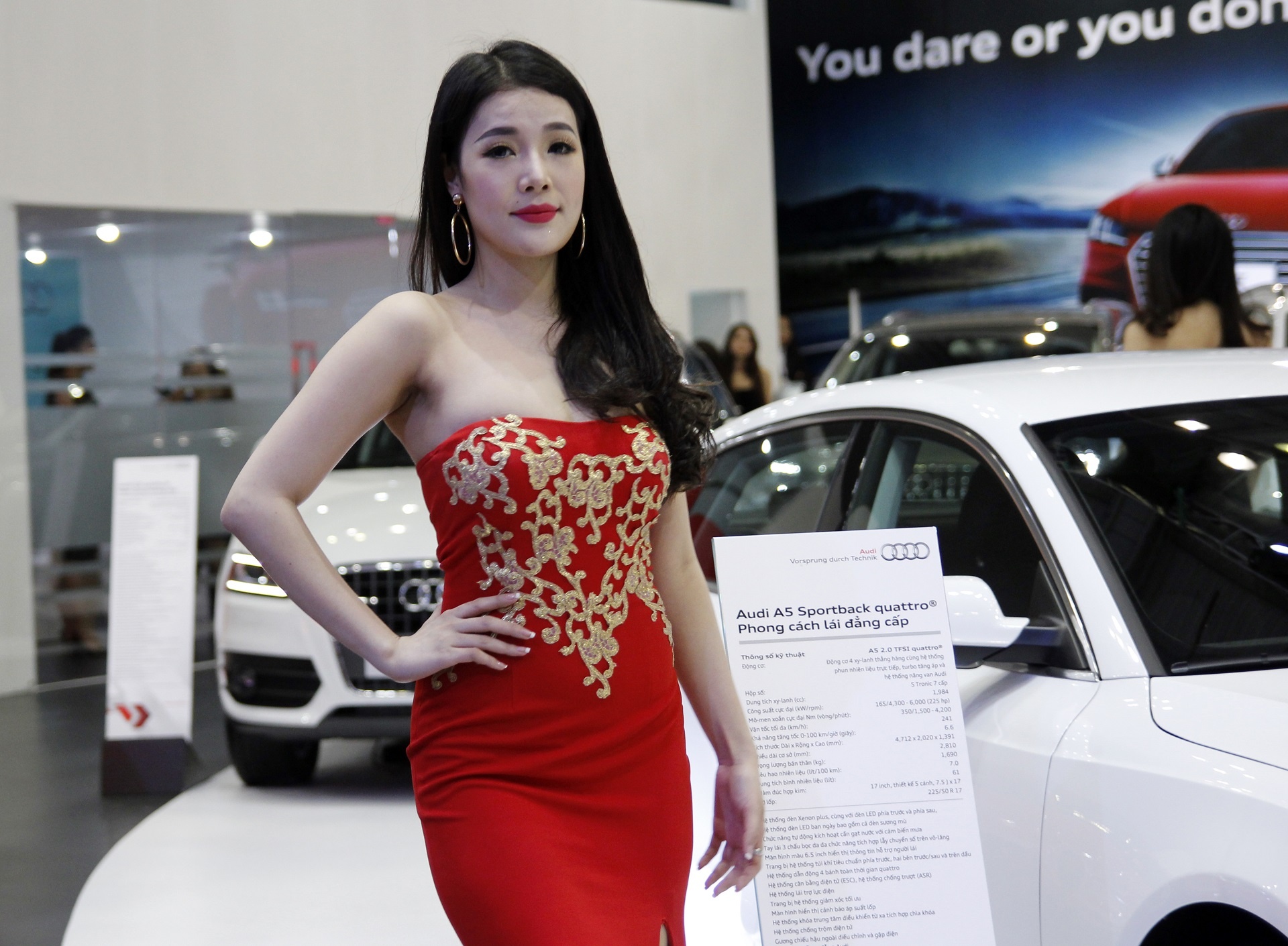 Chân dài xuất hiện với vai trò đại sứ của thương hiệu Audi, cô tạo dáng cùng những mẫu xe mới của hãng xe Đức tại Vietnam Moto Show 2014.