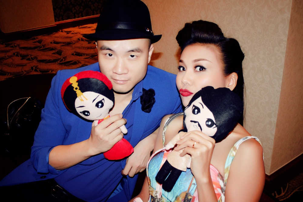 Nhìn các phiên bản Kiều thị - Kiều ca do các fan làm tặng Thanh Hằng, NTK Đỗ Mạnh Cường không giấu được sự thích thú. Anh vội vã mượn những món đồ này để... pose hình cùng nữ giám khảo xinh đẹp.