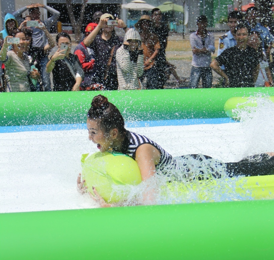 | Thanh Hằng tận hưởng giác bật tung mát lạnh sau khi tham gia đường trượt nước trên phố. |