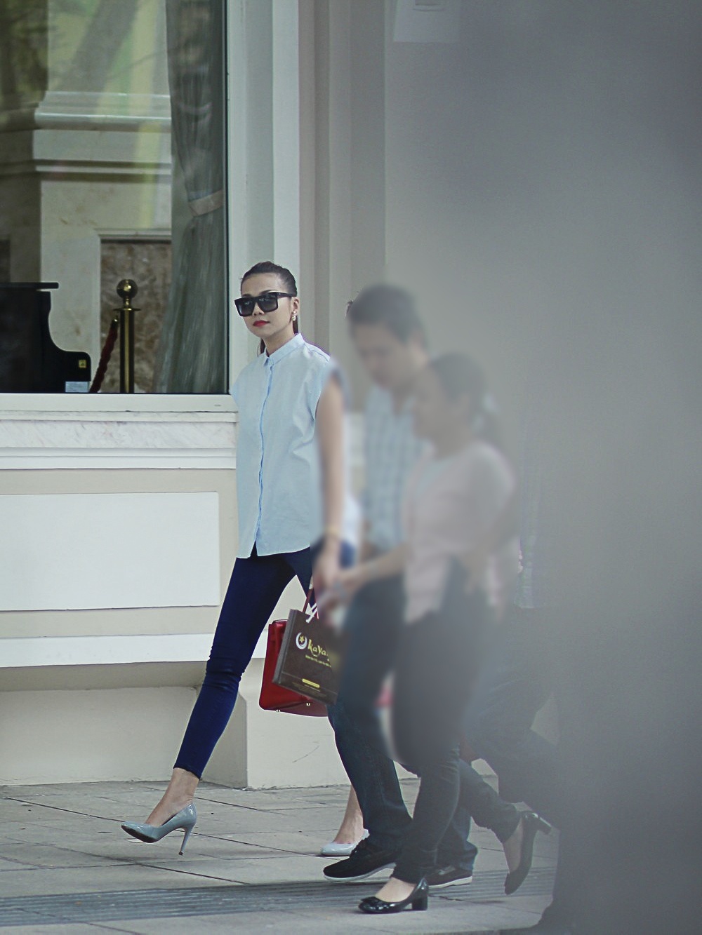 Nữ giám khảo Vietnam's Next Top Model 2013 diện trang phục đơn giản, sơ-mi quần jeans khi thả bộ trên con phố thuộc trung tâm Sài Gòn.