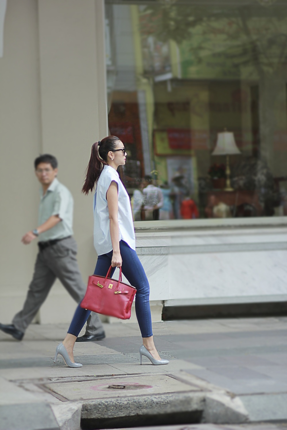 Khi xuống phố, cô không quên mang theo mình chiếc túi Hermes yêu thích.