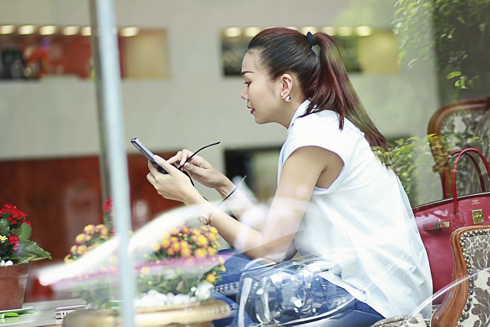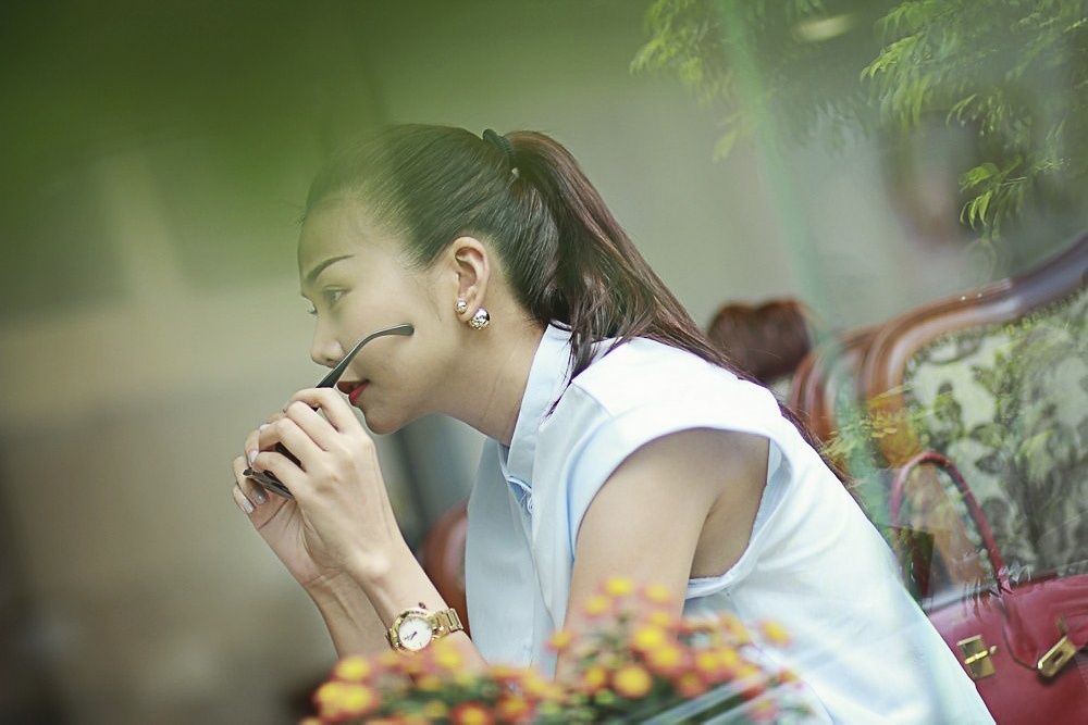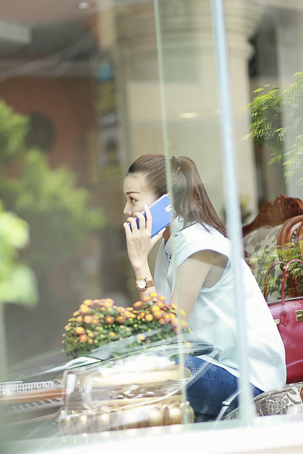 Trong lúc đợi ê-kíp của mình, chân dài bận rộn với những cuộc điện thoại công việc.