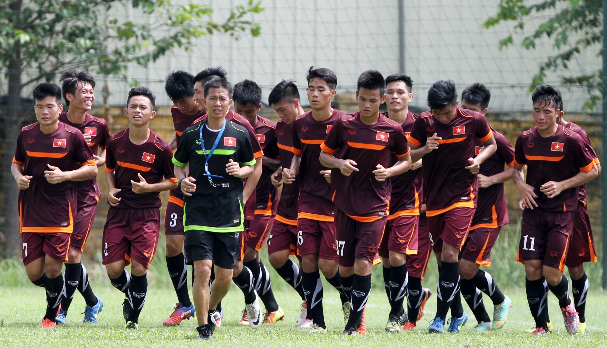 HLV Hoàng Anh Tuấn cùng các học trò chạy thả lỏng trong khoảng 10 phút trước khi kết thúc buổi tập sáng 22/7.