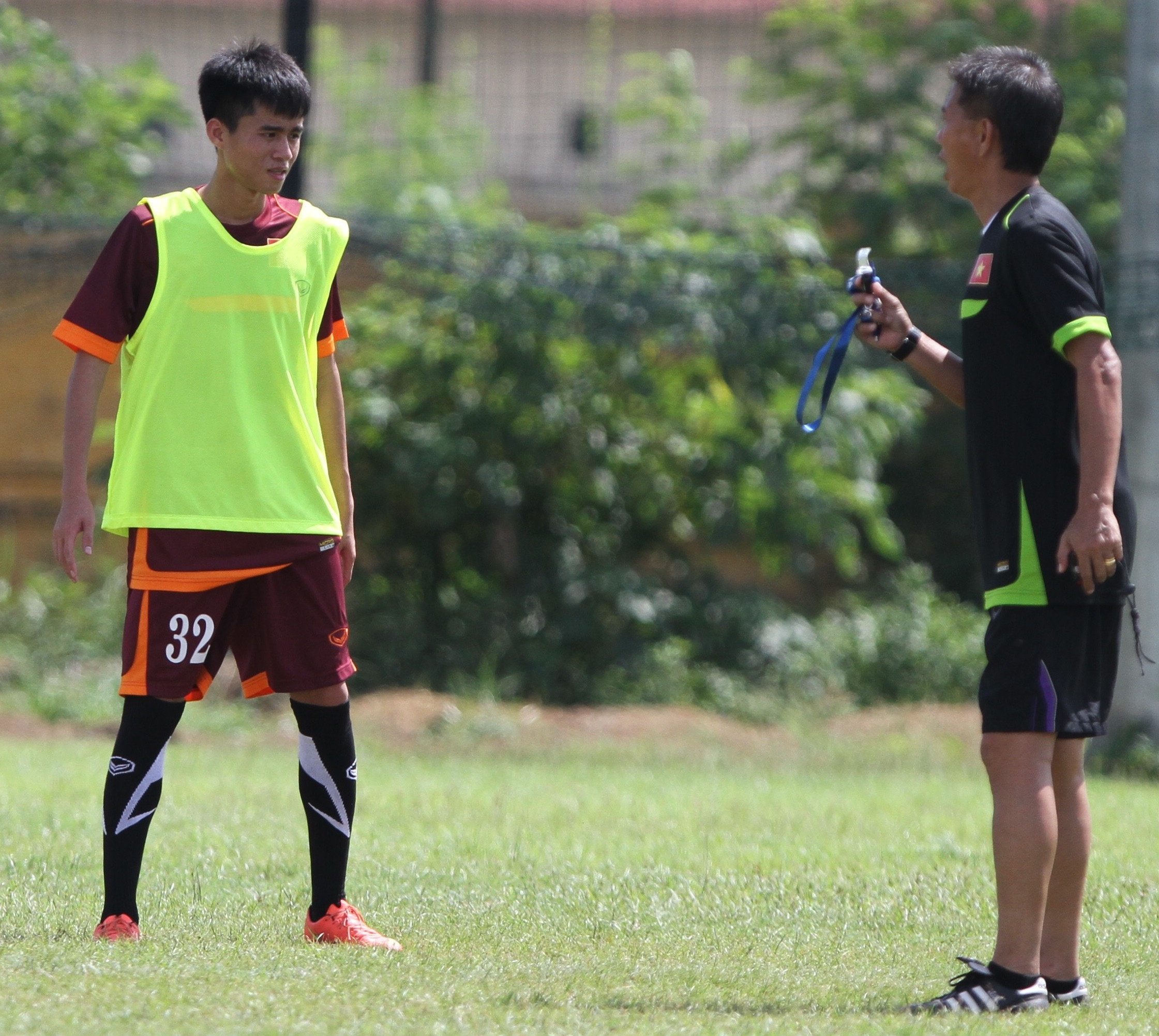 | Sau 1 tuần rèn thể lực vào các buổi sáng, 8h30 hôm nay (22/7), U19 Việt Nam có buổi tập chiến thuật trên sân Trung tâm đào tạo trẻ VFF. Phan Thanh Hậu - cầu thủ trẻ của HAGL hội quân muộn từ tối 21/7 được HLV Hoàng Anh Tuấn dặn dò kỹ lưỡng trước khi bước vào buổi tập đầu tiên cùng toàn đội. |
