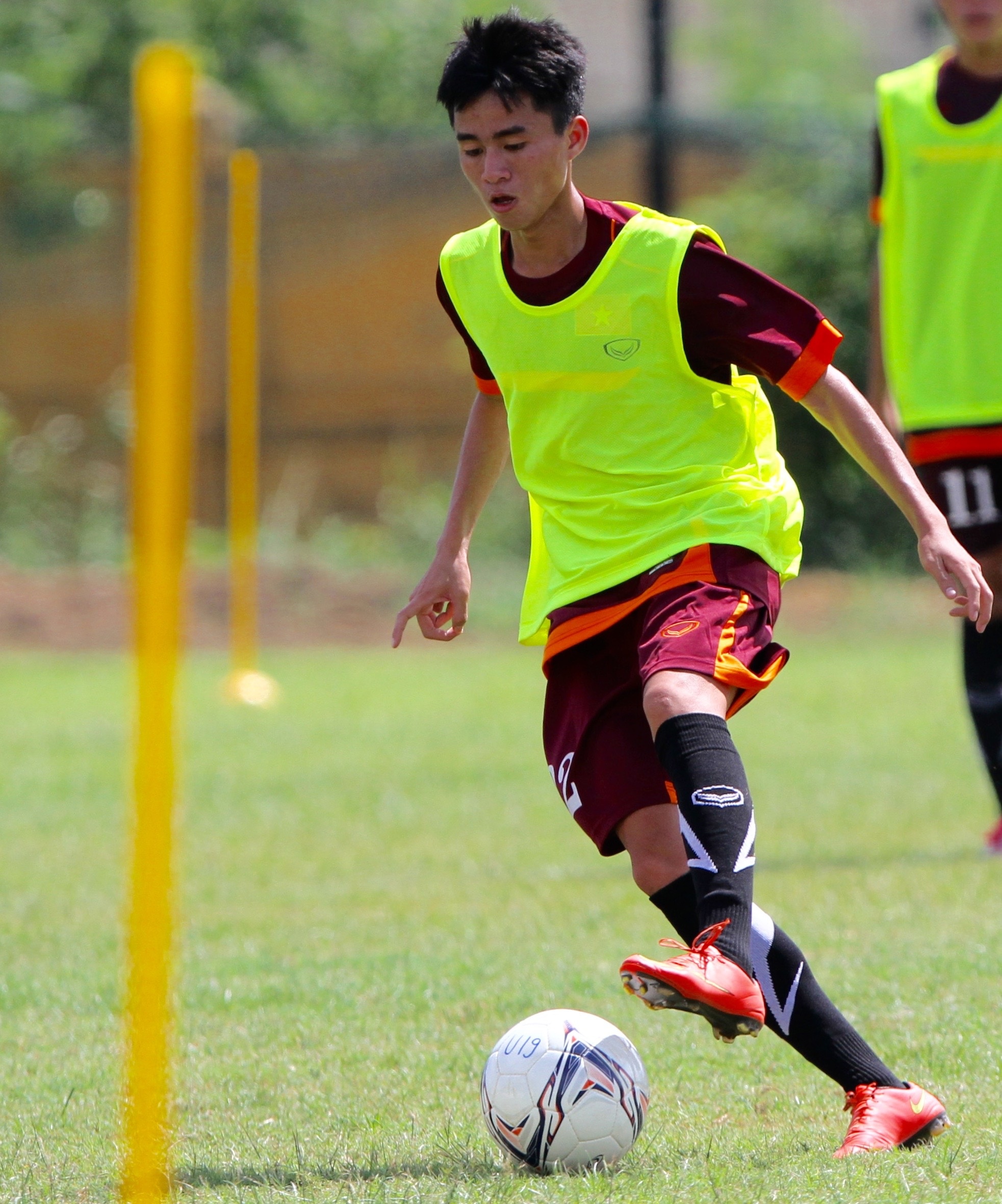 | Cầu thủ gốc Quảng Ngãi tự tin xử lý bóng qua chướng ngại vật trong buổi tập đầu tiên. Từng góp mặt trong màu áo U19 Việt Nam năm 2013 và 2014, Thanh Hậu được HLV Hoàng Anh Tuấn kỳ vọng là trụ cột nơi tuyến giữa của U19 Việt Nam năm 2015. |