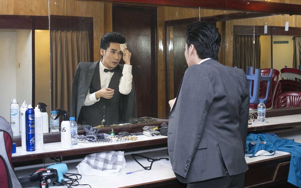 | Nam ca sĩ bận rộn với việc trang điểm trước khi ra sân khấu. |