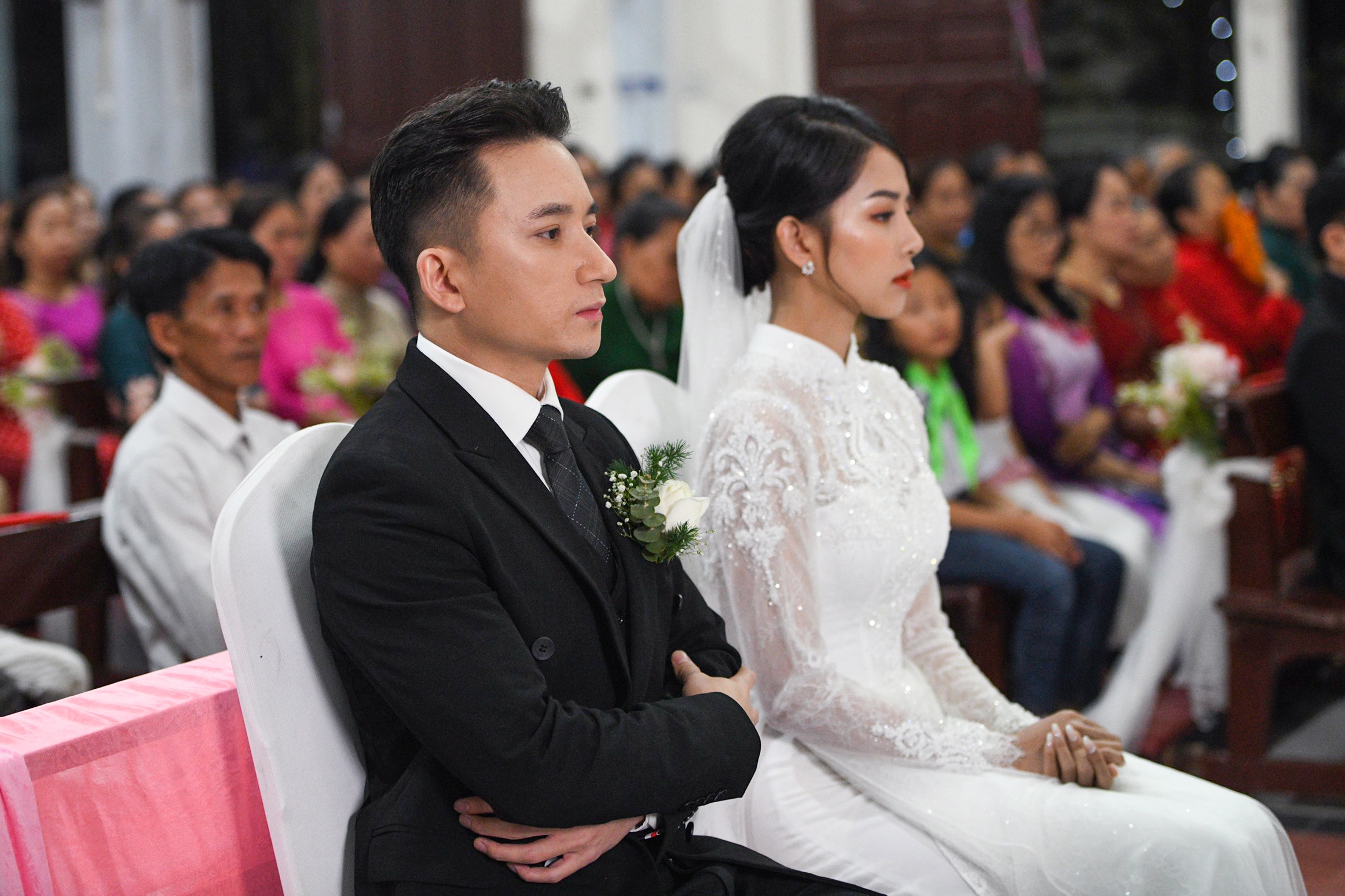 | Trong thánh lễ hôn phối, nhạc sĩ Mắt biếc diện suit đen lịch lãm. Đứng cạnh anh, Huỳnh Khánh Vy mặc áo dài trắng được thiết kế tinh tế. Cả hai khoanh tay, thực hiện các nghi thức của buổi lễ. |