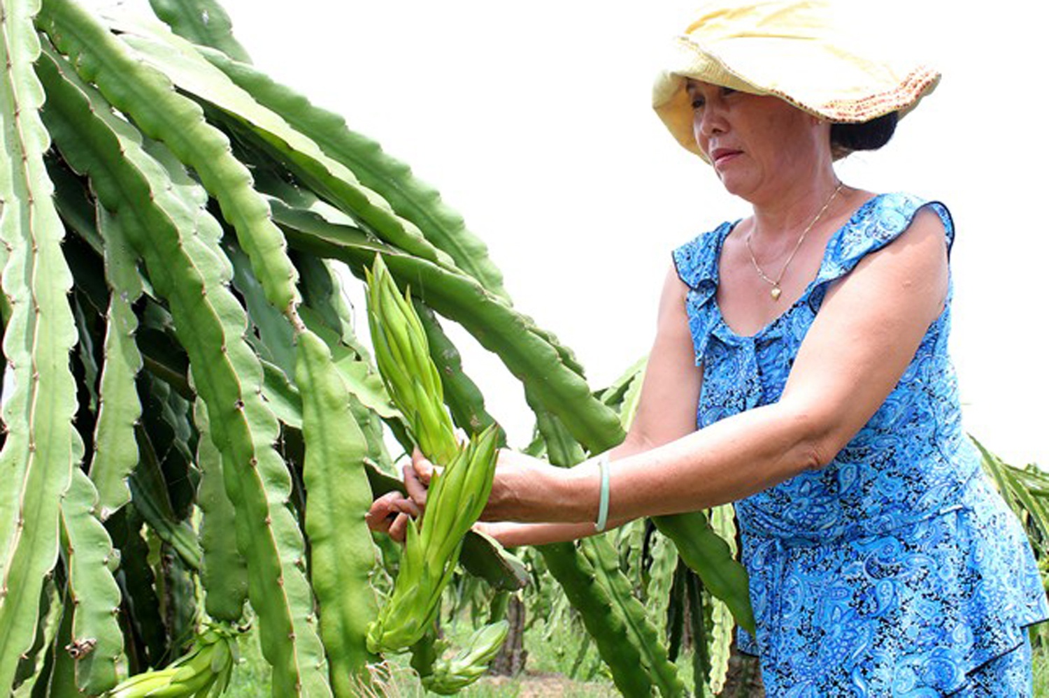 | Ở vụ chính nông dân thường lặt bớt bông để dưỡng cây thanh long chờ đến mùa chạy điện. Ảnh: Zen nguyễn |