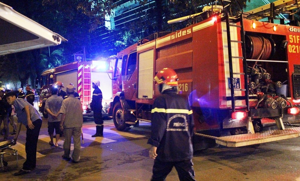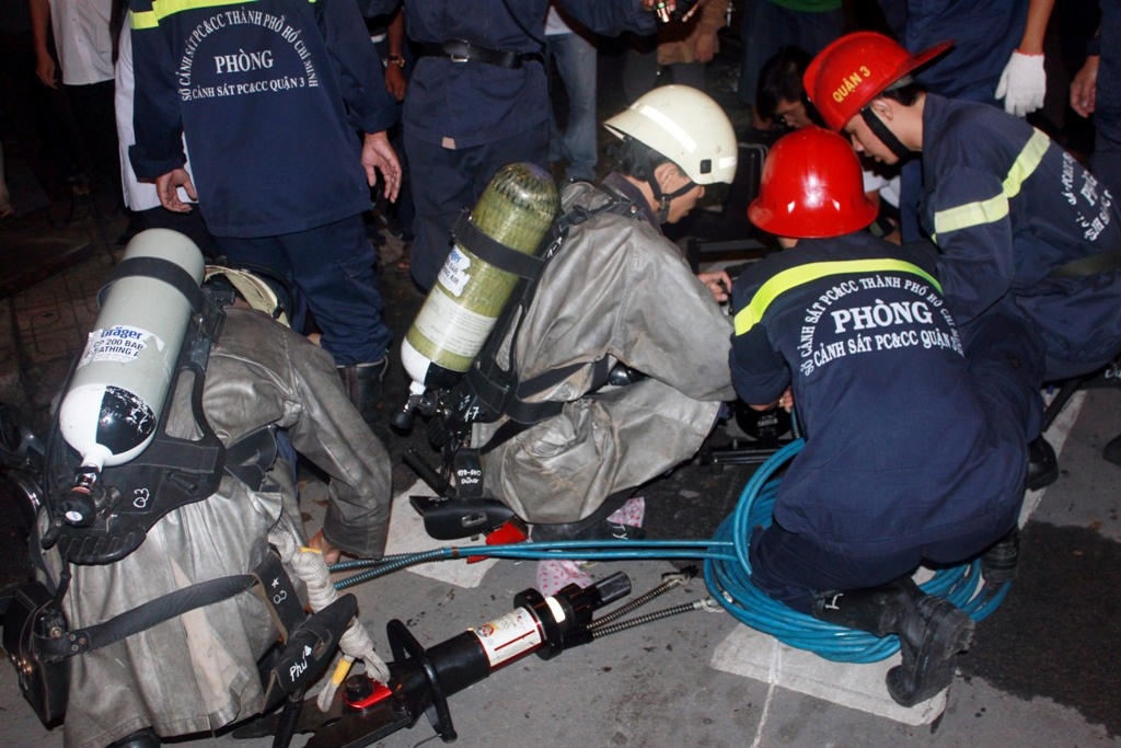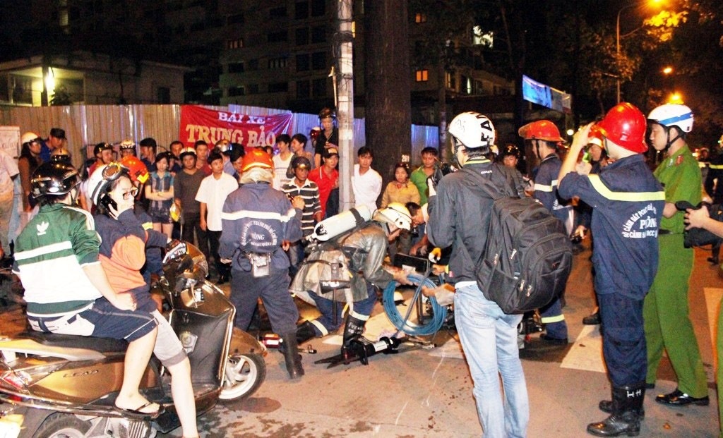 | Một xe cấp cứu được gọi đến hiện trường nhưng các nhân viên y tế cũng không giúp được thanh niên vì không có phương tiện cứu hộ chuyên dụng. Vụ việc được báo lên đội cứu hộ của Cảnh sát PCCC quận 3. |