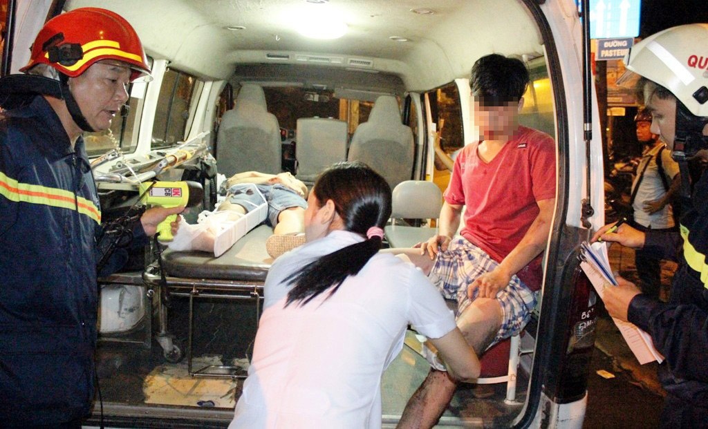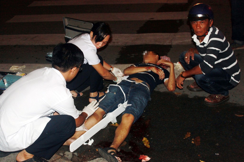 | Anh Đạt được nhân viên y tế căm sóc vết thương trước khi chuyển đến bệnh viện. |