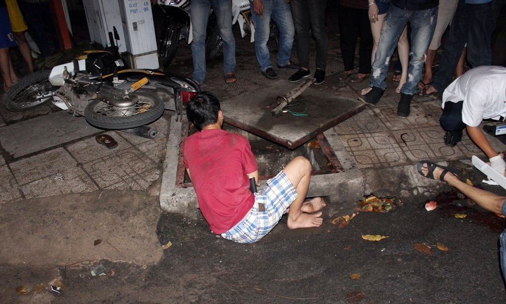Sau khi xảy ra tai nạn, anh Đạt ngã vào vỉa hè, đầu gối chân trái chui vào khe cống thoát nước và bị dính chặt không tự rút ra được.