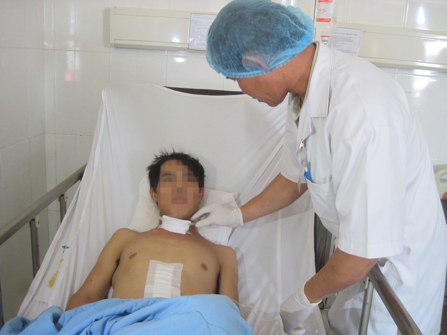 Bác sĩ Nguyễn Đức Thanh - Trưởng kíp mổ khoa Ngoại bệnh viện Đa khoa Thiện Hạnh cho biết - nạn nhân được đưa đến trong tình trạng nguy kịch, khí quản bị đứt, máu phun ra từ vết cắt ở cổ. Ở bụng có vết rạch sâu, mất máu nhiều, tụt huyết áp.