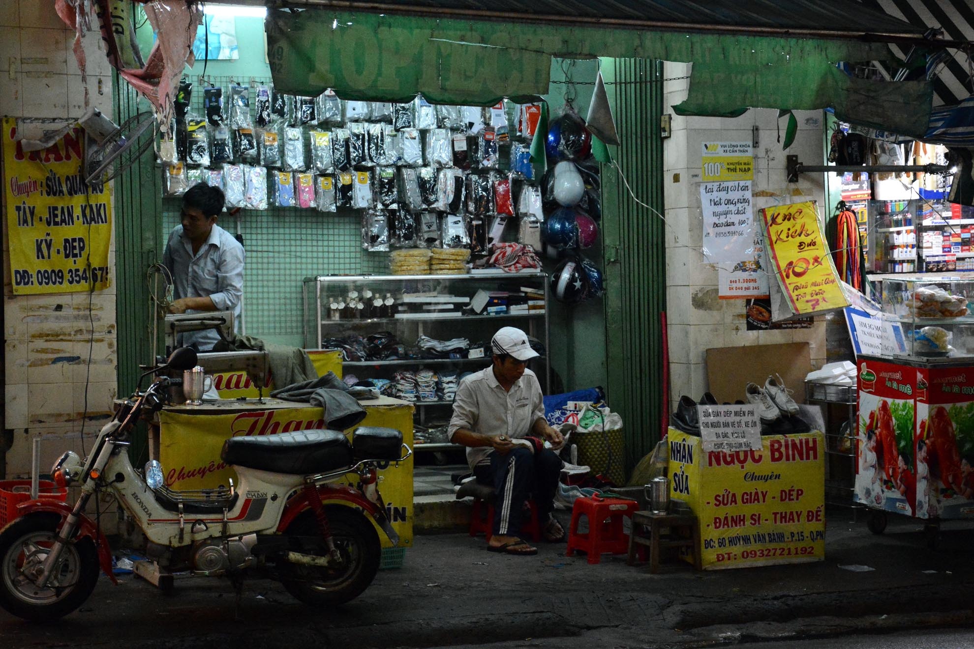 Sau tấm biển ép plastic này là góc làm việc trên vỉa hè của anh Lý Ngọc Bình (30 tuổi, quê Gia Lai) - thanh niên nghèo mưu sinh giữa Sài Gòn náo nhiệt.